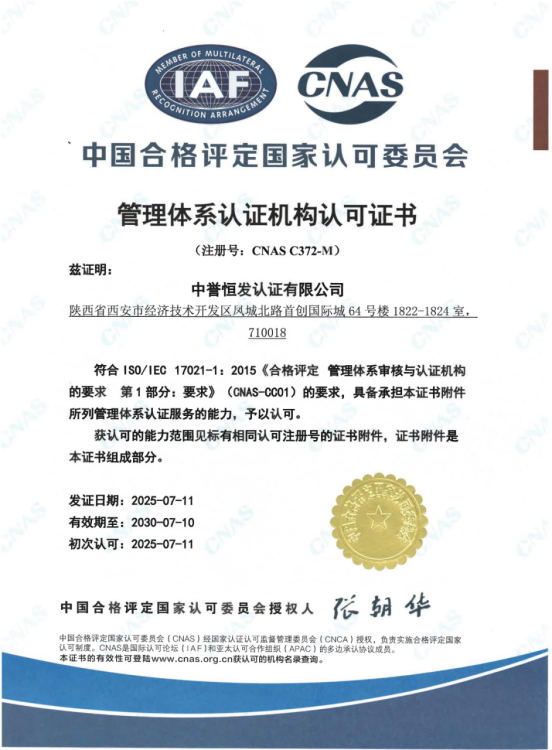 2025年7月11日,中国合格评定国家认可委员会(CNAS)正式授予中誉恒发认证有限公司认可资格(注册号:CNAS C372-M),标志着中誉恒发在质量管理体系、环境管理体系及职业健康安全管理体系认证领域达到国际标准要求。此次认可通过CNAS严格评审,涵盖《合格评定管理体系审核与认证机构要求》等多项准则,其认证结果将获国际互认体系采信。