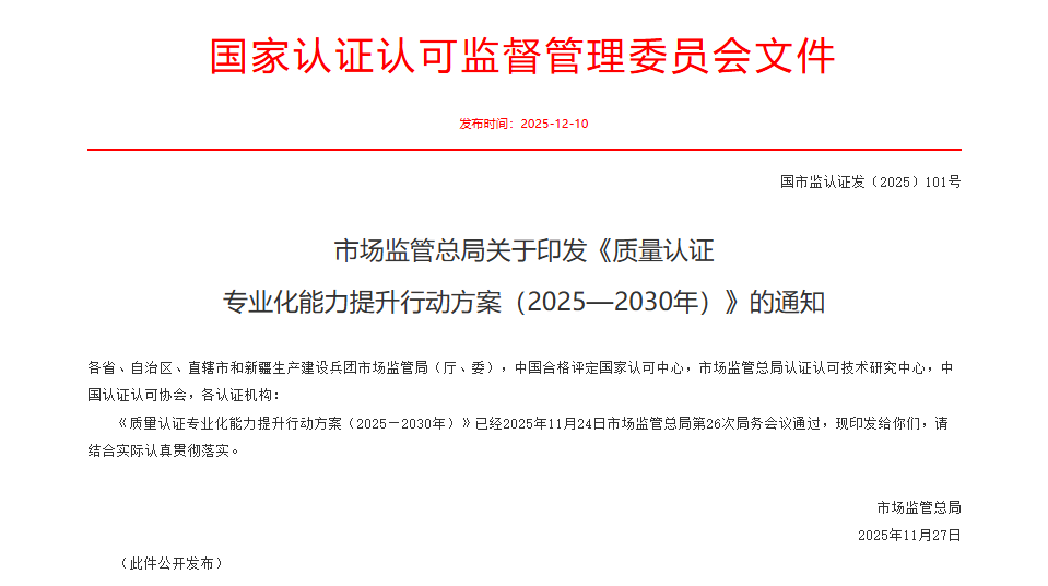 市场监管总局关于印发《质量认证 专业化能力提升行动方案(2025—2030年)》的通知(转)